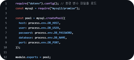 ์ด ์ฝ๋๋ Node.js์์ MySQL ๋ฐ์ดํฐ๋ฒ ์ด์ค์ ์ฐ๊ฒฐํ๊ธฐ ์ํด mysql2/promise ๋ผ์ด๋ธ๋ฌ๋ฆฌ์ ํ๊ฒฝ ๋ณ์(.env)๋ฅผ ์ฌ์ฉํ๋ ์ค์ ์ด์์